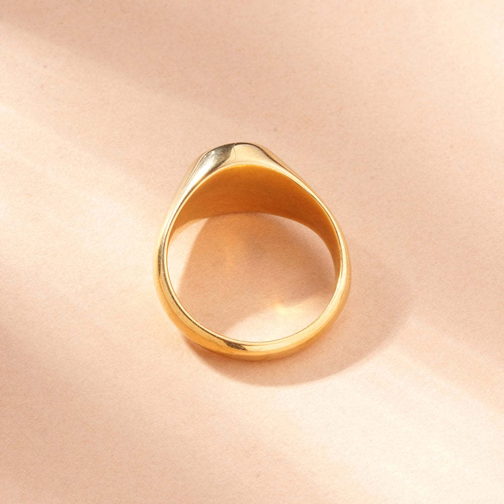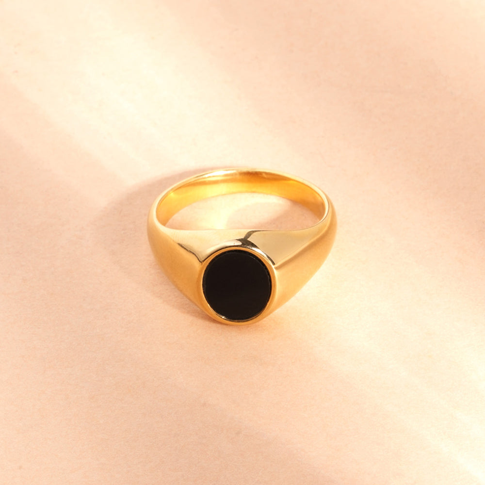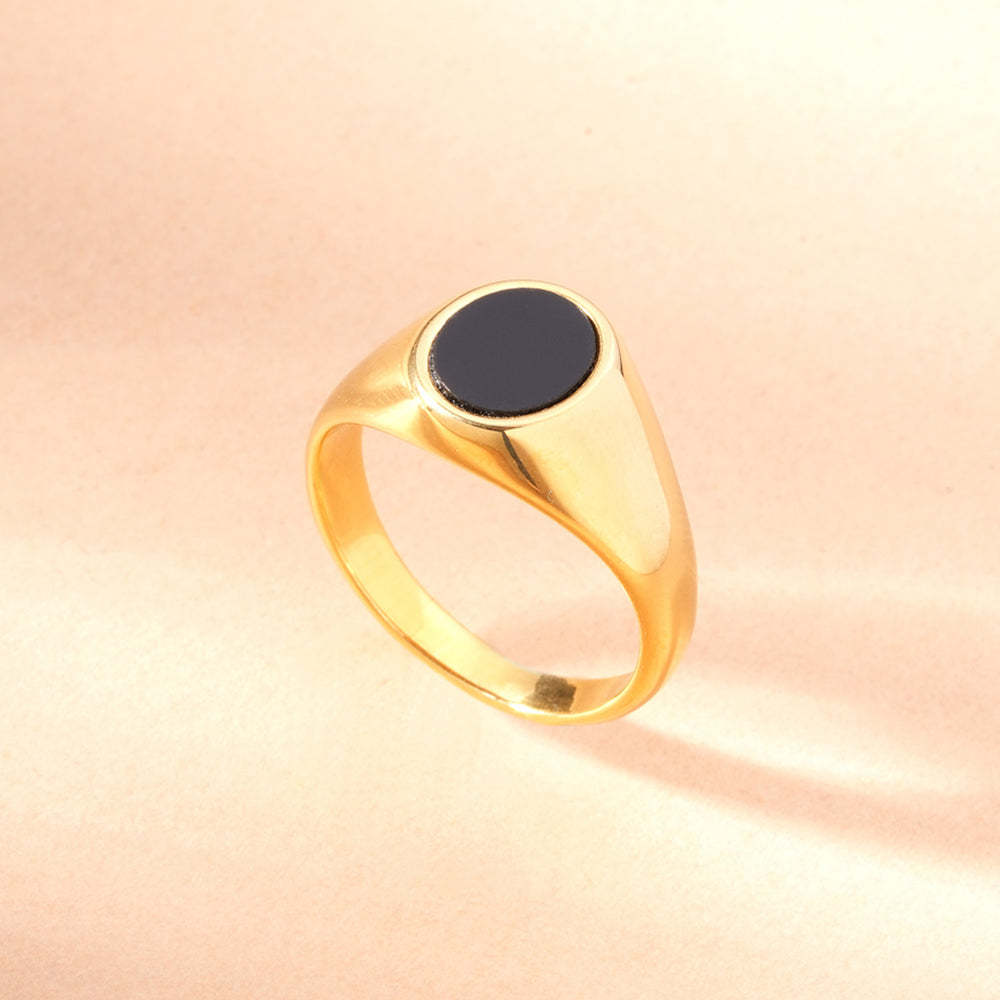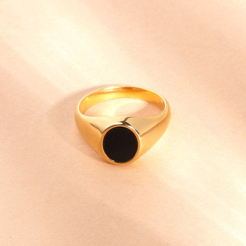 Make your mark. Crafted from stainless steel and finished in rich 18k gold tone, our Black Oval Signet Ring defines quiet power. The deep onyx tone reflects strength and individuality. Waterproof, anti-tarnish, and designed especially for you, for your bold moments of confidence and timeless style.
